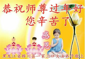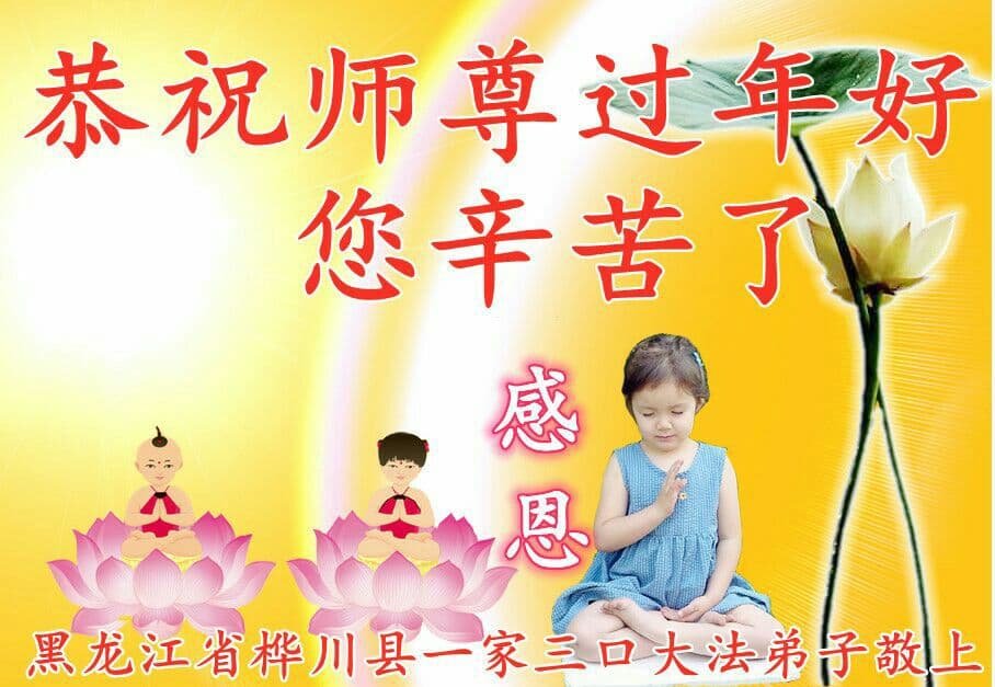 佳木斯市桦川县一家三口大法弟子恭祝师尊:过年好! 新的一年不忘使命,修好自己,多救人! 感恩师尊的慈悲救度! 佳木斯市桦川县一家三口大法弟子敬上 黑龙江省佳木斯市桦川县大法弟子和家人恭祝师尊过年好!
