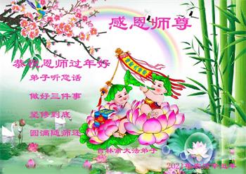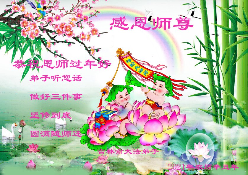 感恩师尊 恭祝恩师过年好! 弟子听您话 做好三件事 坚修到底 圆满随师还 吉林市大法弟子 2021年辛丑年 吉林市三人学法组大法弟子恭祝师尊过年好!