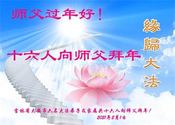 尊敬的师父过年好! 吉林省白城地区大安市六名大法弟子及家属共十六人向师父拜年!祝愿师父过年好!我们会精進实修做好三件事,修好自己。让师父多一份欣慰,少一些操劳!法正人间时,圆满随师还。 2021年2月1日 吉林省白城地区大安市一大法弟子恭祝师尊中国新年快乐!