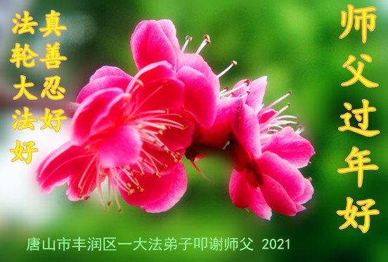 师父过年好!弟子想念您,用尽人间语言难以尽诉您的慈悲苦度之恩,唯有精進更精進来报答师父的浩荡洪恩。 时光荏苒匆匆过, 鞭炮响起又一年; 感恩师尊语难诉, 清香一炷泪涟涟; 阴霾即将驱散尽, 梅花依然报春来; 庚子之年恶疫虐, 邪恶末后妖雾澜; 神来审判人大选, 邪魔妖精尽表演; 真修弟子紧随师, 世间乱象不迷眼; 精進实修不懈怠, 难中救人是大愿; 宇明天清百花妍, 恭迎师尊喜团圆。 唐山市丰润区一大法弟子敬上 2021年2月 河北省唐山市古冶区一大法弟子恭祝慈悲伟大的师尊过年好!