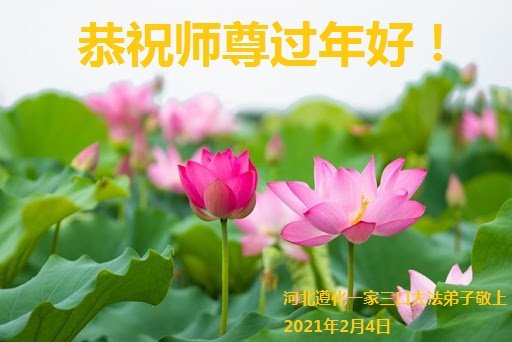感恩师尊的慈悲苦度!我们一定多学法,做好三件事,圆满随师还。 河北唐山遵化一家三口大法弟子恭祝师尊过年好!