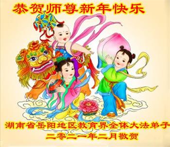 恭祝师尊新年好!感谢师尊救度之恩! 江苏三名中学教师大法弟子携全家跪拜 2021年1月20日 湖南省岳阳地区教育界全体大法弟子恭祝师尊新年快乐!
