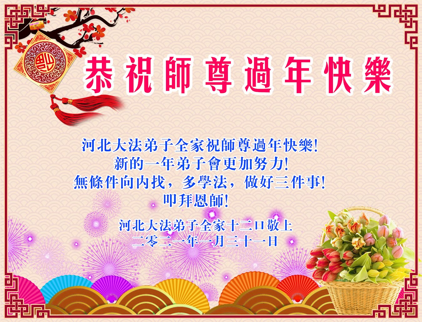 【明慧网二零二一年二月十一日】 河北省衡水市深州市一学法小组大法弟子恭祝师尊新年快乐!