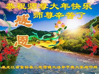 齐齐哈尔大法弟子恭祝师父过年好! 黑龙江省齐齐哈尔市富裕县二道湾镇大法弟子携全家恭祝师尊过年好!