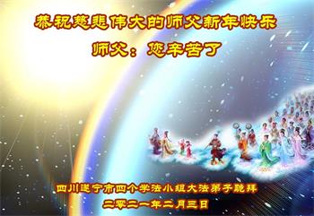 师父好!师父新年快乐!我们28大法弟子会在所剩不多的时间里奋起直追,做好三件事,以报师恩。千言万语汇聚成一句:惟愿师尊笑! 四川遂宁市一大法弟子恭祝慈悲伟大的师父新年快乐!师父辛苦了!
