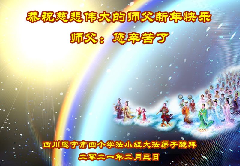 在有限的时间里,我们10位大法弟子一定勇猛精進,修炼如初,让师父欣慰! 弟子跪拜!合十 四川遂宁市大法弟子恭祝慈悲伟大的师尊新年快乐!师父辛苦了!