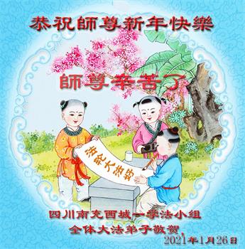 师尊你辛苦了! 二零二一年一月二十七日 四川南充西城一学法小组全体大法弟子恭祝师尊新年快乐!