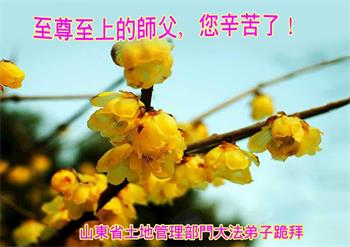 没有师父的慈悲保护,就没有弟子的今天!是伟大的师尊给了弟子返本归真的机会,使弟子能够在宇宙大法中修炼。师尊的佛恩浩荡,弟子穷尽一切也无以为报!弟子唯有谨遵师父的慈悲教诲,做好三件事,救度那些被邪*党-毒害的生命,给他们一个得救的机会! 弟子跪谢师尊救度洪恩!合十! 山东省土地管理部门大法弟子恭祝师尊新年快乐!
