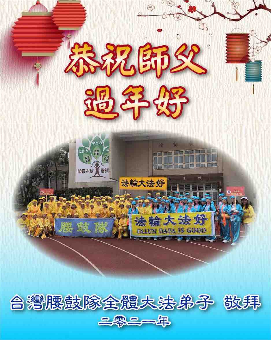 【明慧网二零二一年二月十一日】台湾腰鼓队全体大法弟子恭祝师尊过年好!恭祝师尊过年好! 风起云涌战鼓鸣 邪恶胆寒已途穷 法徒精進紧随师 救度众生步不停 台湾腰鼓队全体大法弟子叩拜 2021中国新年 台湾新北市大法弟子夫妇恭祝师尊过年好!