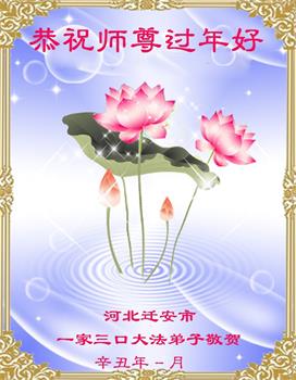 在新的一年里,我们学法小组要形成整体,多学法、学好法,向内找。听师父的话,做好三件事,多救人,让师尊放心。我们要跟师尊回家。谢谢慈悲的师父,合十! 河北省唐山滦州市一家四口大法弟子恭祝师尊过年好!