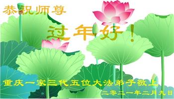 值此新年到来之际, 重庆一家三代五位大法弟子向师父拜年,恭祝师父过年好! 重庆一家三代五位大法弟子合十 敬上 二零二一年二月九日 重庆市大足区全体大法弟子敬祝慈伟大的师父过年快乐!
