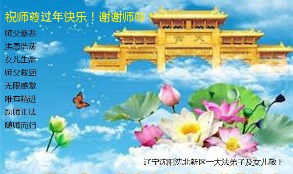 恭祝师尊过年快乐! 辽宁省沈阳市沈北新区一大法弟子和女儿敬上 辽宁省沈阳市大东区五人学法小组大法弟子恭祝慈悲伟大的师父新年好!