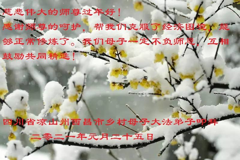 感谢师尊的保护,帮我们克服了经济困境,能够正常修炼了,我们母子一定不负师恩,互相鼓励共同精進! 西昌市乡村母子大法弟子叩拜 二零二一年元月二十五日 辽宁省抚顺市新宾县一农村老年大法弟子恭祝慈悲伟大的师父过年好!