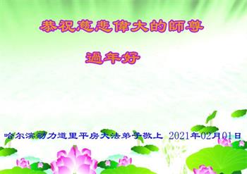 大陆大法弟子想念师父!在这新年佳节来临之际,在这法正人间的来临之际,弟子无法表达对师尊的感恩之心。感恩师尊的慈悲救度!弟子还有很多执着心没有修去,弟子一定会修去执着跟上正法進程,努力做好三件事,修好自己多救人。让师尊多一份欣慰,少一份操劳。圆满随师还! 跪拜师尊新年好!法轮大法好!真善忍好! 哈尔滨大法弟子叩拜师尊! 2021年2月5日 黑龙江省哈尔滨市双城市区两家五位大法弟子祝伟大慈祝伟大慈悲的师父过年快乐!
