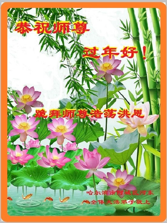 恭祝师尊过年好!感谢师尊慈悲救度! 我们要听师父的话,实修自己,做好三件事,跟师父回家。 哈尔滨阿城河东区一学法小组大法弟子敬上 黑龙江省哈尔滨市平房区动力区道里区大法弟子恭祝慈悲伟大的师尊过年好!