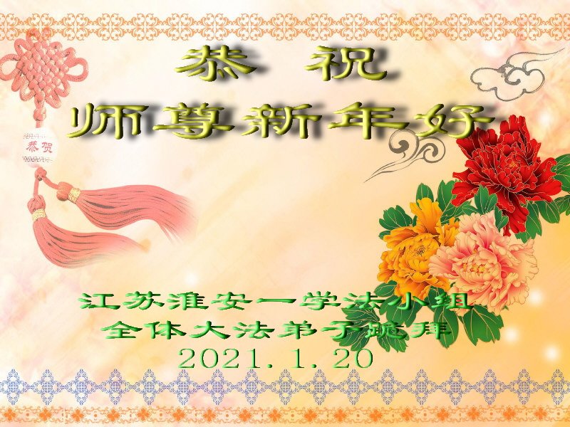 恭祝师尊新年快乐!感谢师尊救度之恩! 江苏省淮安市全体大法弟子跪拜 2021年1月20日 江苏省淮安市一学法小组全体大法弟子恭祝师尊新年快乐!