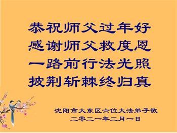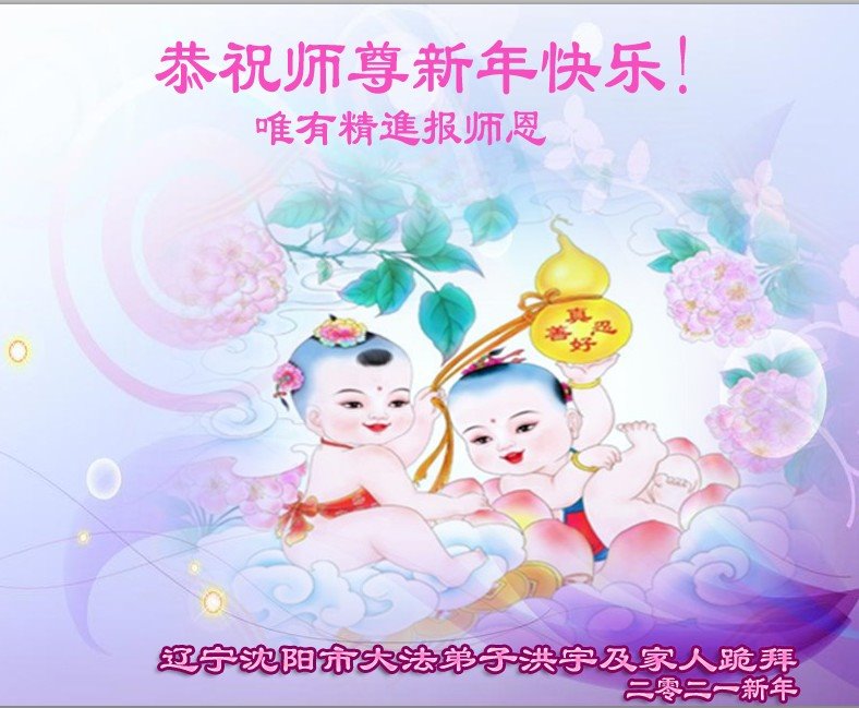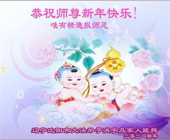 师尊过年好! 师尊辛苦了!感恩师尊的慈悲救度!唯有精進才是不愧对师尊,才不愧对众生。 叩拜师尊! 辽宁沈阳市大法弟子恭祝师尊新年快乐!