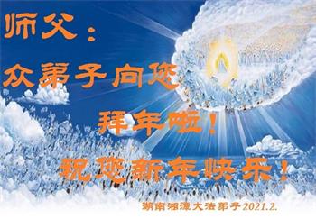 湖南省靖州县大法弟子恭祝慈悲伟大的师尊过年好! 人类到了最后选择自己未来的时候了。感恩师尊慈悲保护!在新的一年里,弟子一定更加精進实修,一定不负师尊苦心救度! 湖南省怀化市靖州县大法弟子跪拜合十 2021年1月28日 湖南省湘潭市众弟子向师父拜年!