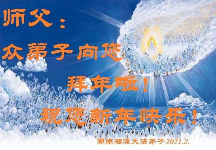 新的一年到来,我们要加倍做好自己该做的事情,真正的像个大法弟子,真正的走在助师正法、救度世人的正法修炼路上,摆正基点,在思想和行动中坚定的敬师敬法!知道自己是大法弟子, 一思一念要以法为大。 放下各种情和各种欲望,修掉一颗颗人心,净化自己的思想,让自己的一思一念都在法上。做好三件事,兑现史前誓约,跟师父回家。 恭祝师父过年快乐! 叩首合十 2021年1月28日 湖南省娄底市新化县全体大法弟子恭祝慈悲伟大的师尊过年快乐!