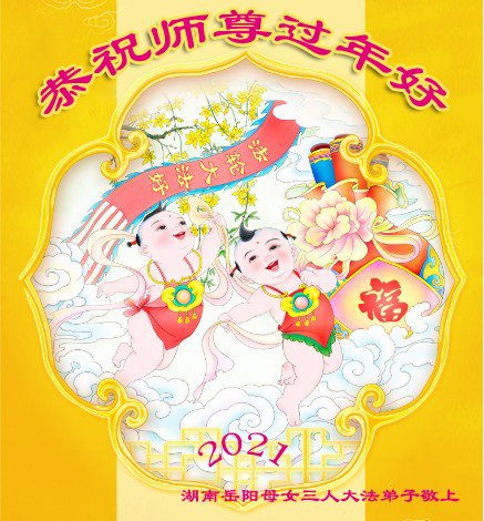 师尊:您辛苦了!弟子无法用语言表达对师尊的感恩。弟子无限感恩师尊在这末世乱世中的慈悲救度。谢谢慈悲伟大的师尊!遥祝师尊新年快乐! 湖南省岳阳市母女三人大法弟子恭祝慈悲伟大的师尊2021年过年好!