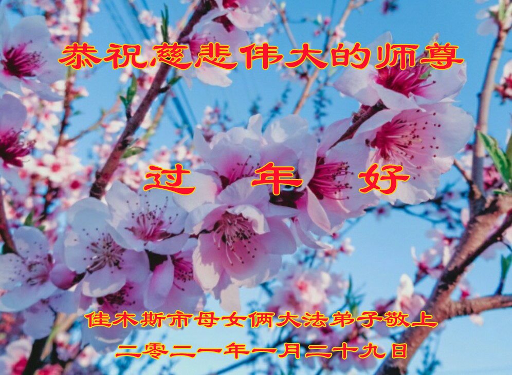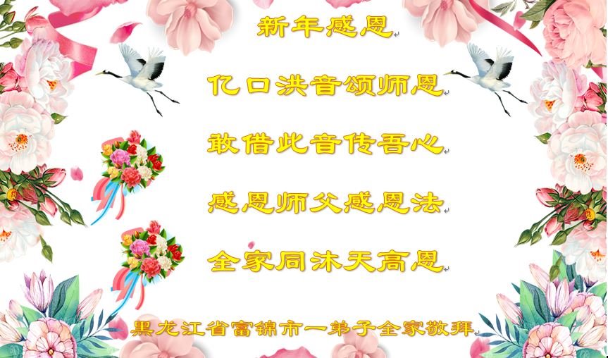 【明慧网二零二一年二月十二日】 黑龙江省佳木斯市富锦市一大法弟子全家敬拜师父过年好!