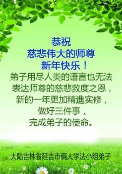 转眼又一年,谢谢恩师时时刻刻保护弟子,让弟子在修炼中逐渐成熟起来。请师父放心,弟子会成熟、理智的在助师正法、救度众生中兑现自己的史前誓约。 吉林省延吉市大法弟子叩谢师恩! 大陆吉林省延边州延吉市两人学法小组大法弟子恭祝慈悲伟大的师尊新年快乐!