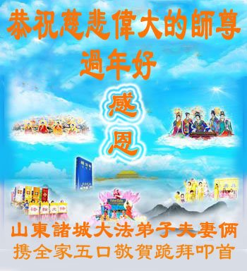 山东省潍坊市诸城市大法弟子夫妻俩携全家五口人恭祝慈悲伟大的师尊新年快乐!
