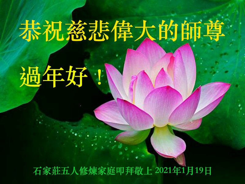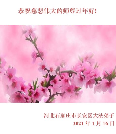 师父辛苦了! 弟子们一定紧跟师父正法進程,以法为师,向内找修好自己,不被人间乱象所带动,抓紧时间最大限度的讲真相救度众生,兑现自己的誓约,圆满随师还。 石家庄大法弟子五人叩拜师尊 2021年1月19日 河北省石家庄市正定县全体大法弟子恭祝师父新年好!