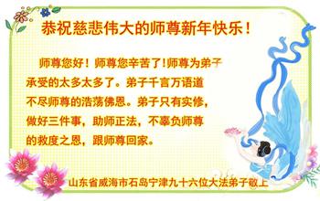 新年到来之际,衷心恭祝慈悲伟大的师父新年快乐!作为一个正法时期的大法弟子一定不辱使命,做好三件事,修好自己,兑现誓约。 山东省烟台市牟平区全体大法弟子恭祝慈悲伟大的师尊过年好!