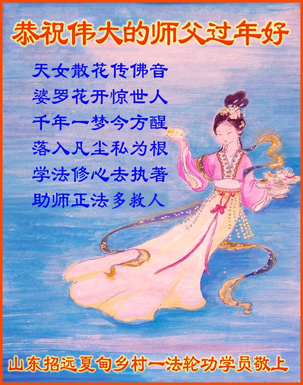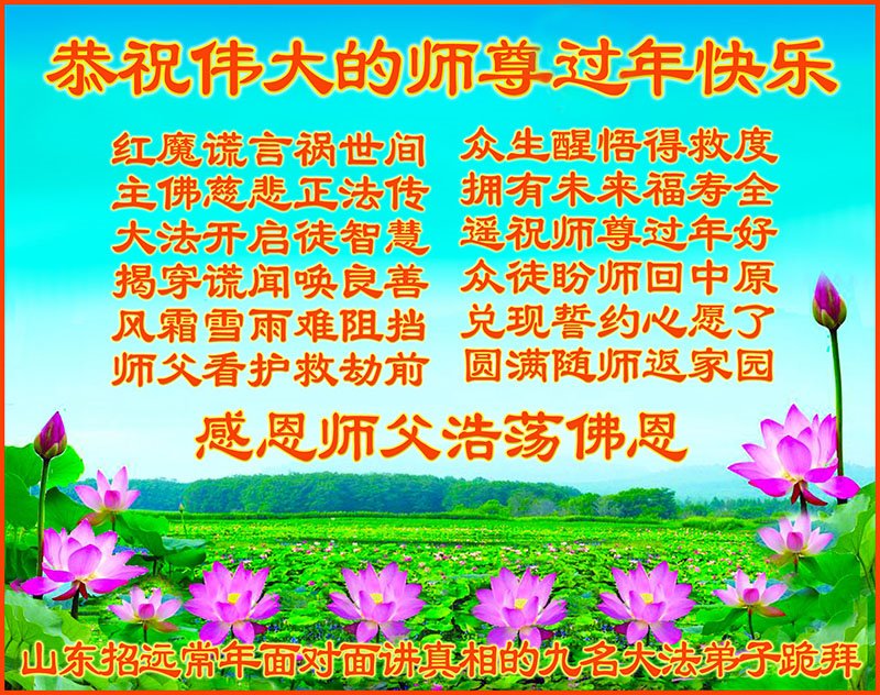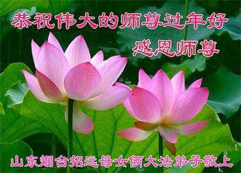 在新的一年里,敬请师父放心,我们学法小组大法弟子一定比学比修,遇事向内找,发好正念,讲清真相,多救人,不辜负师父的慈悲苦度。 海阳市一学法小组大法弟子叩拜师父! 山东省烟台市海阳市老俩口大法弟子恭祝师父过年好!