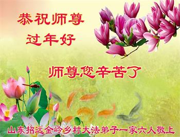敬请师父放心,在新的一年里,我们把遇到的一切事都看成是好事,一定会无条件的向内找,在法中归正自己。踏踏实实做好三件事,不辜负师父的慈悲苦度。 海阳市大法弟子一家五口叩拜师父! 山东烟台招远一家三口恭祝慈悲伟大的师父过年好!