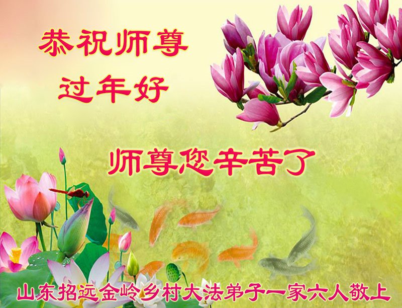 感恩慈悲伟大的师父!我还没有正式走入大法修炼中,但我有时间就看宝书《转法轮》。我在大法中受益,师父给了我全家幸福,丈夫体贴、公婆疼爱,还有了一个健康活泼可爱的女儿。 我们全家人叩拜师父!祝师父过年好! 山东莱芜一大法弟子恭祝师父新年快乐!
