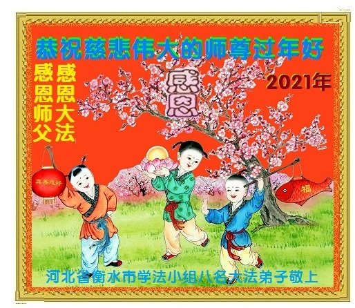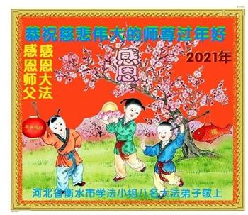 恭祝师尊新年好! 在这最后的时间里,弟子誓要谨遵师命,兑现誓约,牢记使命,舍尽人心,修好自己多救人。让慈悲的师尊多一些安慰,少一些操劳。 弟子叩拜师恩! 黑龙江省黑河北安市一大法弟子敬上 二零二一年一月二十六日 河北省衡水市深州市全体大法弟子恭祝师尊新年好!