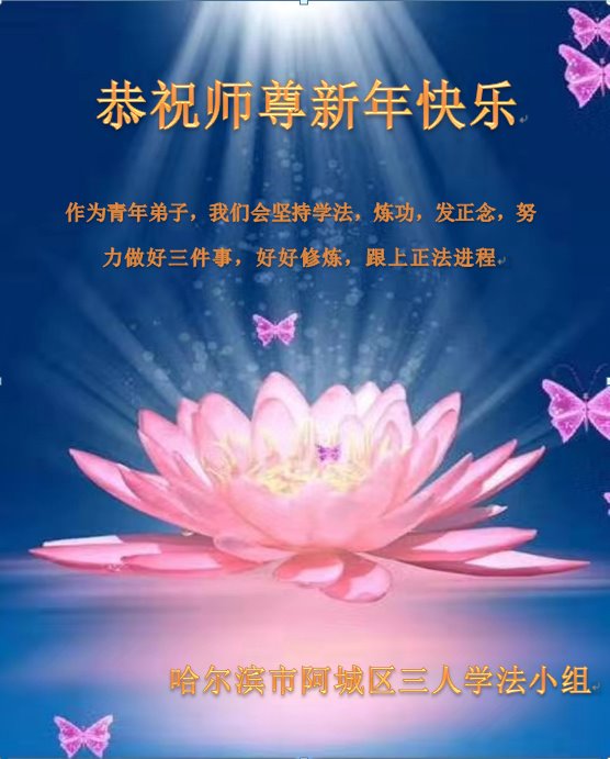 黑龙江哈尔滨市阿城区三人学法小组大法弟子恭祝师父新年快乐!