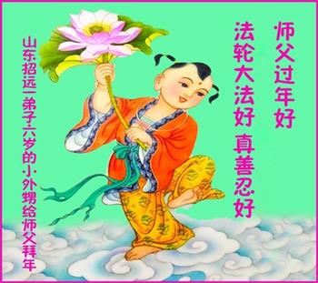 传统的中国新年又快到了,我以诚挚的心祝师尊过年好! 我没上过学,二十几年来,在任何环境下都坚修大法心不动,已经能通读大法书。讲真相救人,按师尊的教导去做,不辜负师尊苦度,师尊辛苦了! 山东龙口大法弟子 山东烟台招远一大法弟子六岁的小外甥给师父拜年!