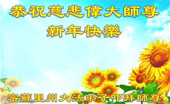 感谢师尊苦心救度。弟子要更精進修炼,努力做好三件事。叩谢师恩! 美国密苏里州大法弟子恭祝师尊新年快乐!