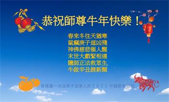 春来冬往天犹寒 鼠窃庚子逞凶残 神佛慈悲催人醒 末世大戏紧相连 随师正法救众生 牛启辛丑展新颜 美国密苏里州全体大法弟子恭祝师父过年好!
