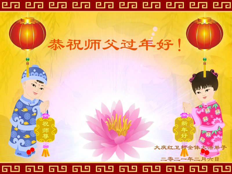 在过去的一年里,在师父的保护下,弟子平稳的走在正法路上。在新的一年里,弟子定会勇猛精進,做好师父交代的三件事,兑现史前誓约。 大庆红卫村全体大法弟子恭贺 二零二一年二月六日 黑龙江省大庆大法弟子恭祝师尊过年好!师尊您辛苦了!