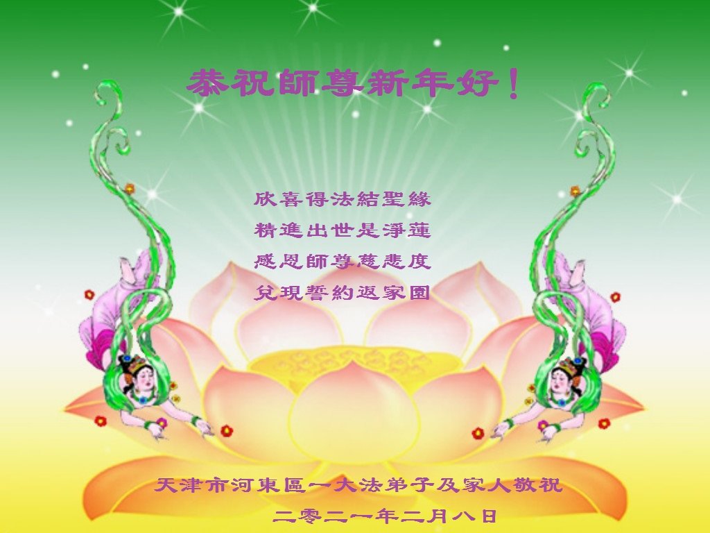 欣喜得法结圣缘 精進出世是净莲 感恩师尊慈悲度 兑现誓约返家园 河东区一大法弟子及家人敬祝 二零二一年二月八日 天津市全体大法弟子恭祝师尊过年好!