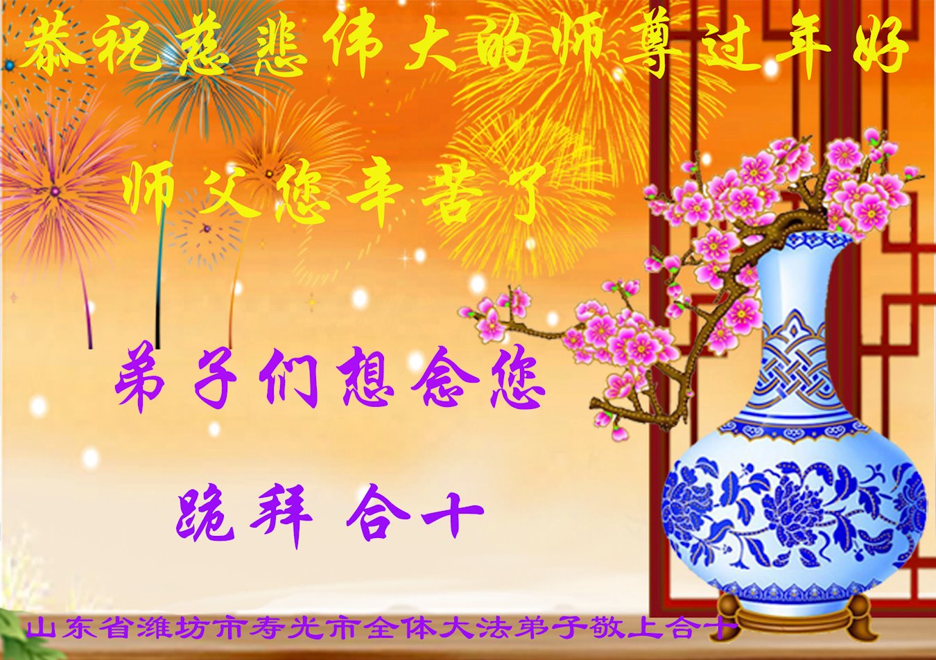 诸城市一学法小组大法弟子跪拜师父:恭祝师父过年好! 弟子们一定听师父的话,学好法,修好自己,多救人。 山东省潍坊市寿光市全体大法弟子恭祝慈悲伟大的师尊过年好!