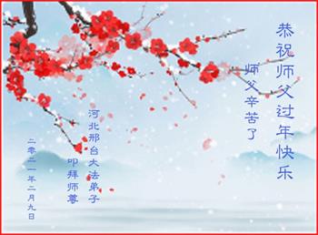 我们迎来了2021年中国新年,我们深知只有相信大法、“三:退.”才能躲过大劫难,我们给师尊快乐的礼物就是抓紧多救人,同时学好法,修好自己。 在此新年之际,我代表沧州道东大法弟子恭祝师尊新年快乐!同时感恩师尊的慈悲保护,弟子们一定会更加勇猛精進,让师尊多一些欣慰。 沧州道东大法弟子 2021年2月9日 河北邢台大法弟子恭祝师父新年快乐!