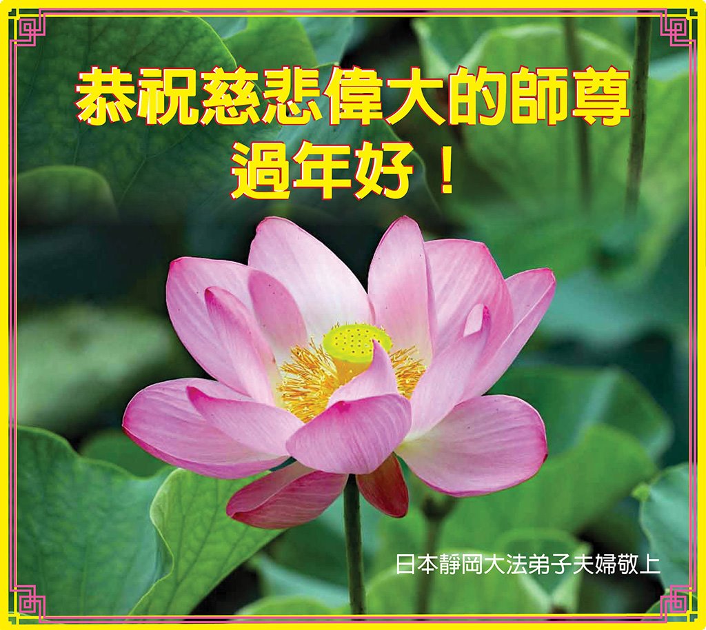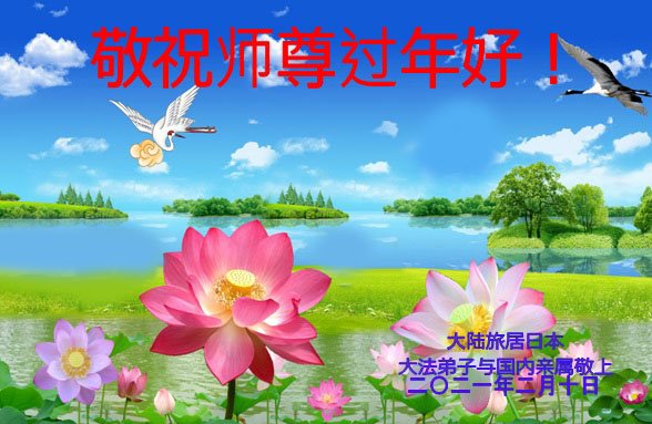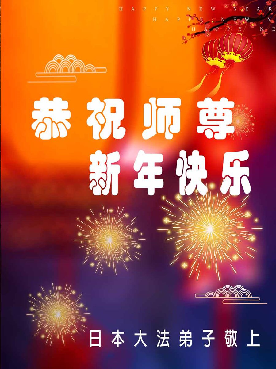中国大陆家乡的中国新年又到了,每逢佳节倍思亲。我满怀着对慈悲伟大师尊救度之恩的感激与深情思念,千言万语不知该如何表达对师父的感恩之心。道一声:师父您辛苦了!感恩师尊慈悲救度,谢谢师父!恭祝师尊新年快乐!在新的一年里,我一定精進实修,兑现誓约,做好三件事,让师父多一份欣慰,少一份操劳。紧跟师尊,共同走向美好的家园!谢谢师父!师父新年好! 日本法轮大法弟子恭祝师尊过年好!