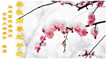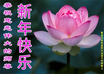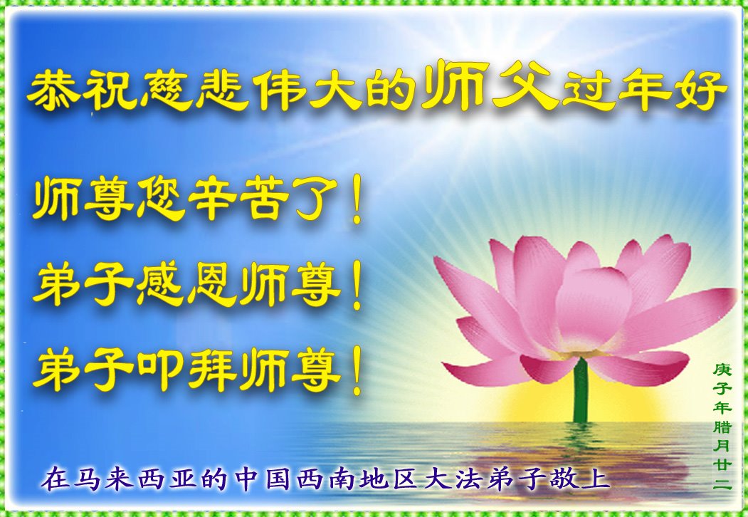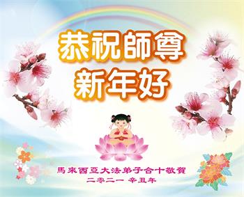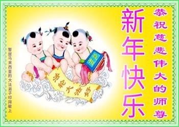 恭祝慈悲伟大的师尊新年快乐! 得大法体健身轻 修大法慧眼渐明 感恩师尊嘱叮咛 师教诲点亮心灯 识破邪恶阴谋形 一路掌舵把航领 真言洗心污浊荡 师尊承受巨难擎 谨遵师教修心性 二十二载随师行 消失遁形邪恶净 救众兑誓返天庭 暂居马来西亚的大法弟子叩拜敬上 暂居马来西亚的大法弟子恭祝慈悲伟大的师尊新年快乐!
