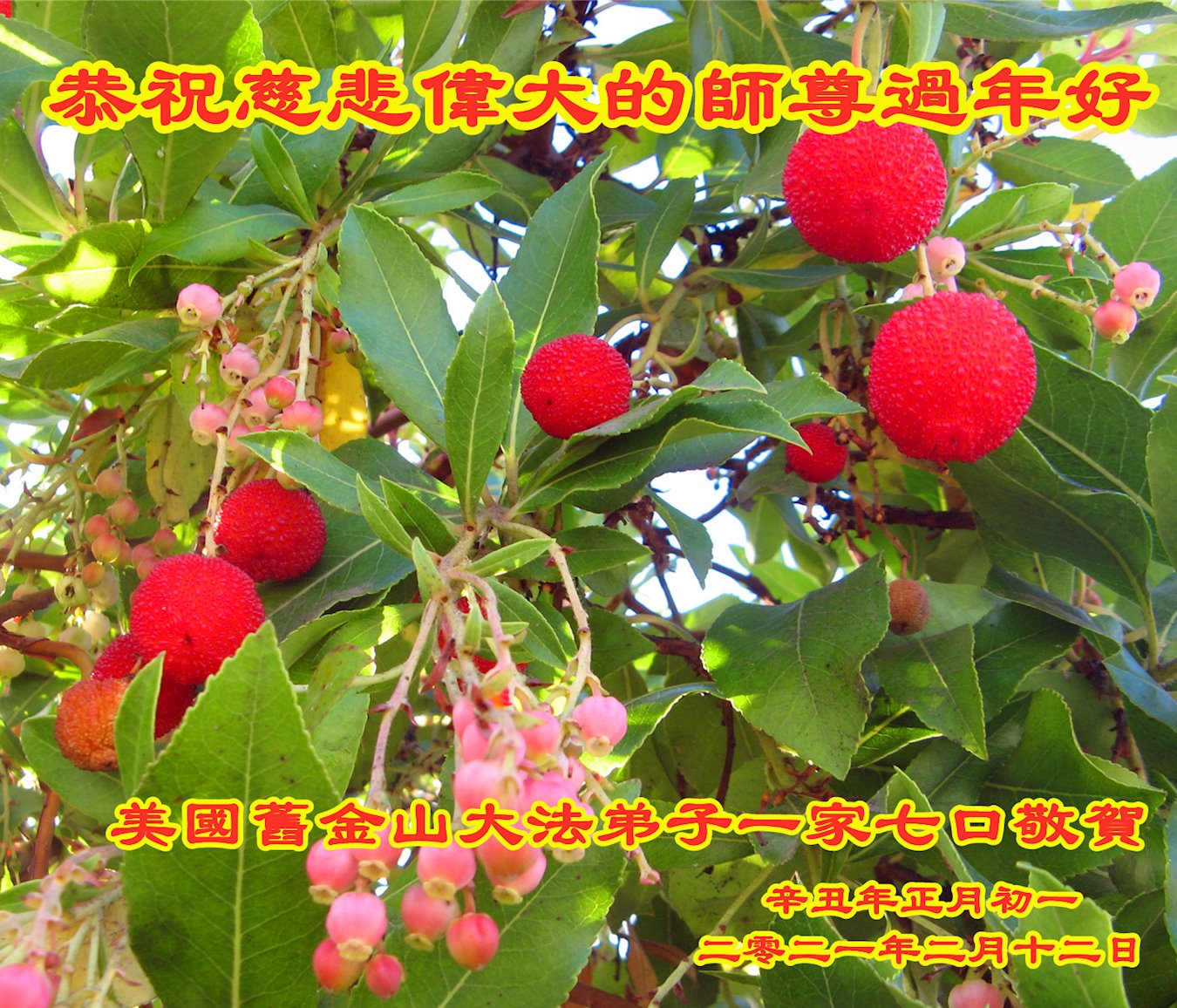 美国旧金山大法弟子一家七口恭祝慈悲伟大的师尊过年好! 给师尊拜年 跪拜师尊新年好! 法徒修行循师道 大选位置人自定 良善存留邪恶淘 辛丑年正月初一 二零二一年二月十二日 夏威夷大法弟子及家人恭祝慈悲伟大的师尊新年好!