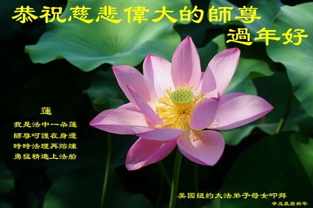 感恩师父慈悲与辛劳! 环宇多庞大 大法最宏大 权贵财多大 得法之众福最大 纽约法拉盛大法弟子给师尊拜年! 美国纽约一大法弟子携家人恭祝慈悲伟大的师父新年快乐!
