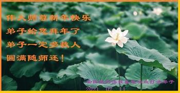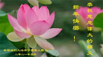 恭祝师尊新年好!在新的一年,弟子一定精進实修,溶于法中,整体提高、整体升华,真正起到助师正法,不负师恩浩荡。弟子携家人敬上! 美国纽约一大法弟子恭祝慈悲伟大的师父新年好!