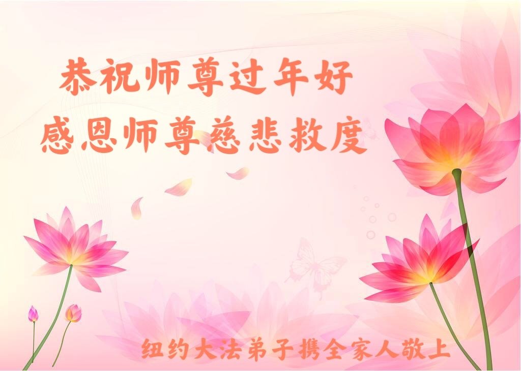 恭祝慈悲伟大的师父过年好!感恩师尊的慈悲救度 ! 大法弟子家属母亲姐妹全家感谢李大师!感恩李大师恩赐的一切,法轮大法好!真善忍好! 居住美国纽约母女俩位大法弟子敬上 美国纽约大法弟子恭祝慈悲伟大的师父新年好!