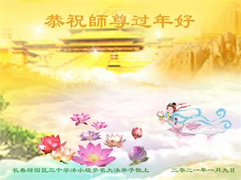 恭祝慈悲伟大的师尊过年好!弟子们合十叩拜师尊! 在中国新年之际,感恩师尊长久以来的慈悲救度与对弟子们的时时保护。无法用人世间的语言表达对师尊的无比感恩之心,唯有走好最后所剩不多的路,以兑现来世时的誓约。 长春市绿园区三个学法小组多名大法弟子敬上 二零二一年一月九日 吉林省长春市德惠市一大法弟子恭祝师尊过年好!