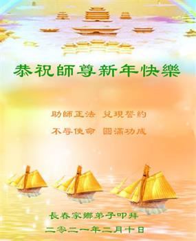 恭祝师尊新年快乐! 在新的一年里,弟子们会做好三件事,勇猛精進。 吉林省长春市青年大法弟子恭祝师尊新年快乐!