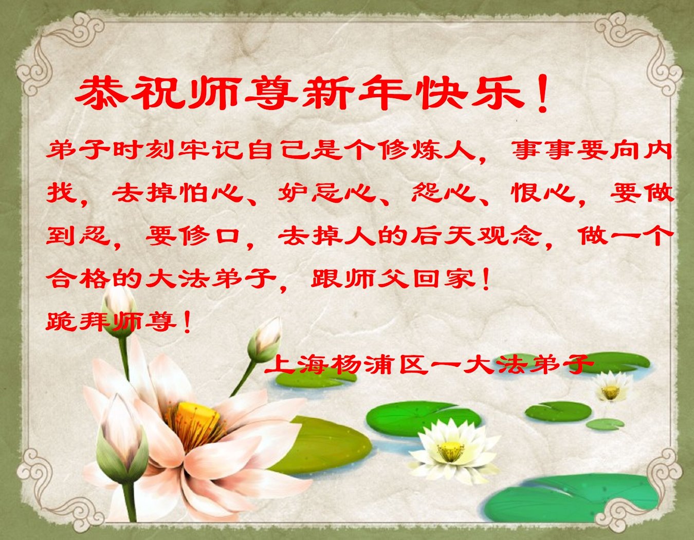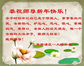 恭祝师尊新年快乐! 弟子时刻牢记自己是个修炼人,事事要向内找,去掉怕心、妒嫉心、怨心、恨心,要做到忍,要修口,去掉人的后天观念,做一个合格的大法弟子,跟师父回家! 跪拜师尊! 上海杨浦区一大法弟子敬上